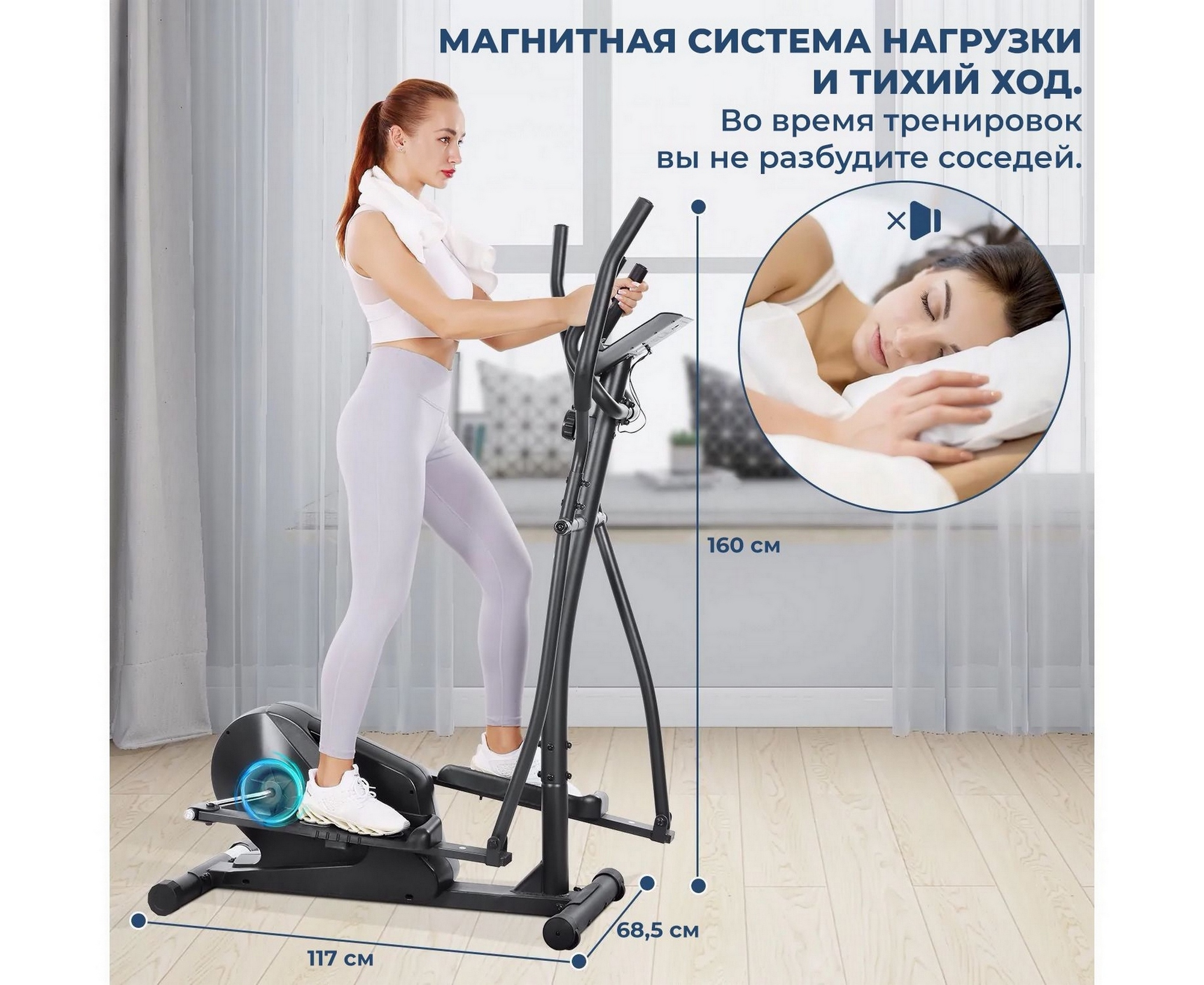 Магнитный эллиптический тренажер рекомендован для людей со средним уровнем физической подготовки. Интенсивность нагрузки распределяется равномерно путем приближения и удаления магнитов от маховика. Практически бесшумен, компактен.