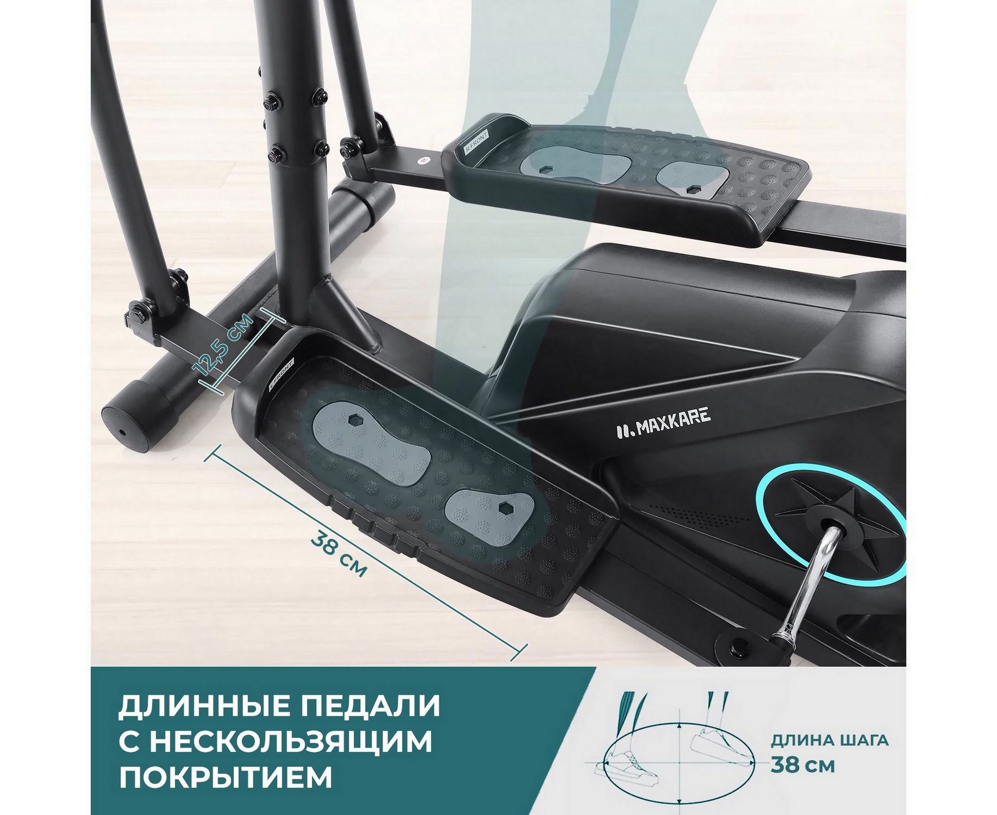 Важным параметром для эллиптического тренажёра является длина шага. В зависимости от моделей значения минимальной длины шага колеблются от 5 до 54 см, а максимальные от 31 до 99 см. Под этим параметром подразумевается расстояние между платформами в крайних положениях. Чтобы подобрать оптимальную длину шага, нужно учитывать рост и физиологические особенности. При неправильно выбранных длинах, будет страдать техника выполнения упражнения.